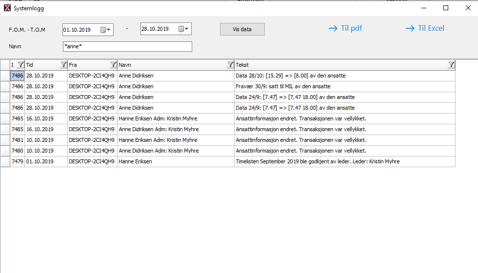 Du kan søke i systemloggen på dotospenn og navn. Husker du bare deler av navnet kan du sette en * foran og bak. Loggen viser i detalj hva som er gjort.