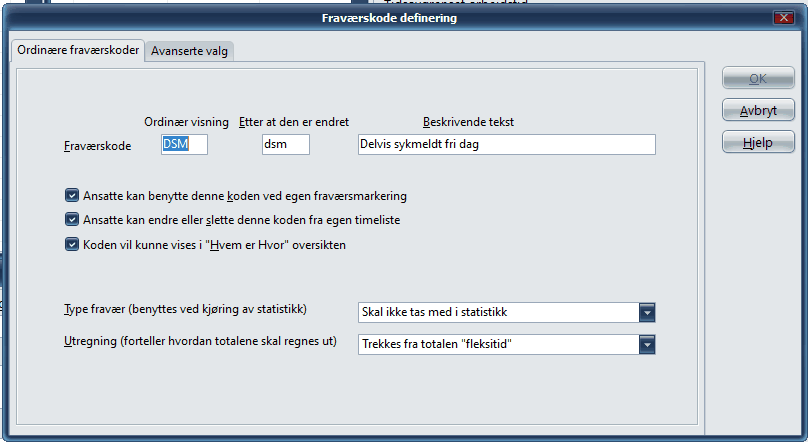 Navigation: Verktøy menyen > Fraværskode >