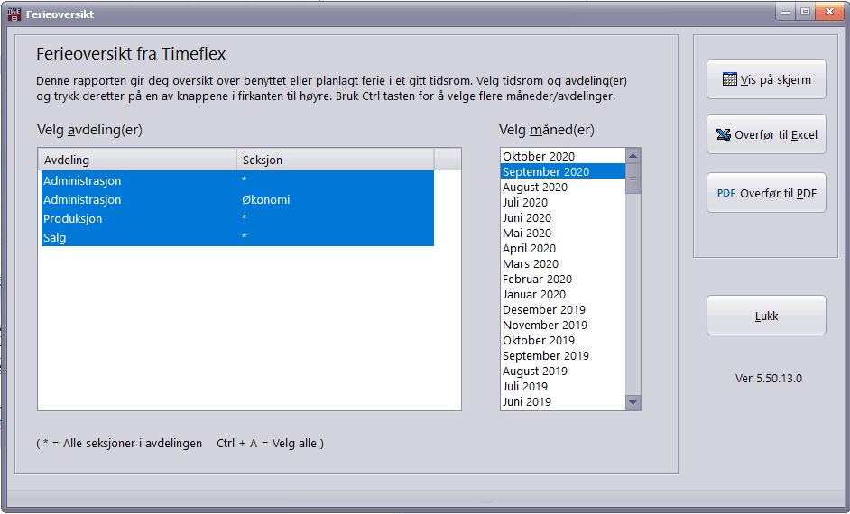 Velg rapporter og ferieoversikt. Velg så måned og avdeling(er).