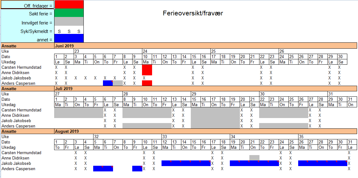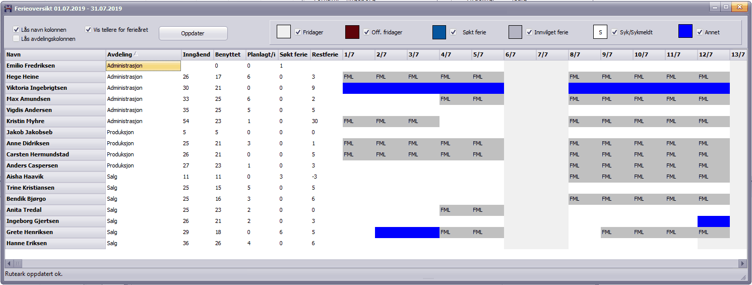 Denne rapporten viser avviklet og planlagt ferie. Den er et god verktøy når noen søker ferie. Den viser om man har nok bemanning i ferieperioder.