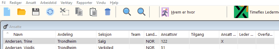 Som leder kan man godkjenne en ansatt eller merke flere for godkjenning ved å holde shift eller ctrl tasten nede og velge. Lag ansattvinduet litt større slik at kolonnene for "Ansatt godkjent", "Leder godkjent" og "Overført lønn" er synlige som vist over. Tast F5 for å oppfriske kolonnene underveis.