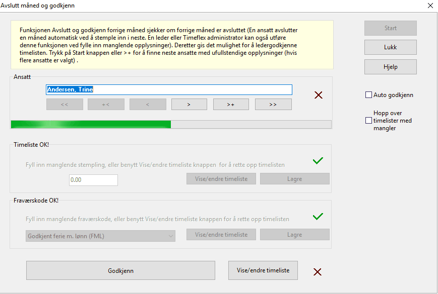 Merk: Du må gå igjennom alle de ansatte du valgt enten ved å trykke Start eller >+ eller enkeltvis via < og >. Funksjonene << eller >> vil ikke automatiske avslutte og godkjenne timelisten, men vil bare ta deg til starten eller slutten av listen. En måned som er ufullstendig vises med rødt kryss. Fyll inn manglende opplysning direkte eller via knappen Vise/endre timeliste. Når de nødvendige opplysningene er på plass vises kun grønne haker, og måneden vil med dette være avsluttet og godkjent.