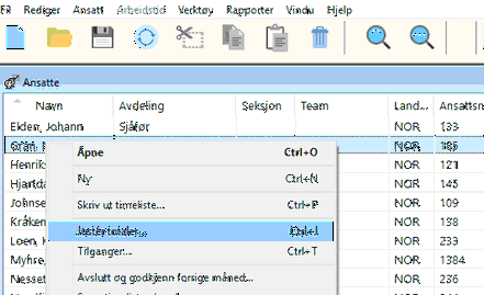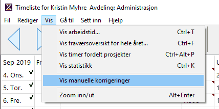 Man har to måter å endre totaler på i Timeflex Pluss. Du kan gå inn i timelisten og velge Vis og Manuelle korrigeringer, eller du kan bruke "Juster totaler" som du finner på høyreklikk i ansattmenyen.