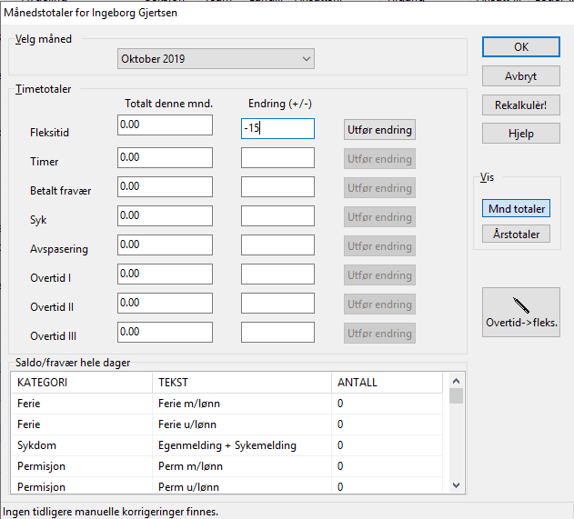 Ved å trykke på knappen Rekalkulèr kan du få Timeflex til å regne ut totalene på nytt utifra dataene i timelisten. Vanligvis trenger man ikke benytte seg av denne knappen. Den brukes ofte hvis en ansatt har ligget med en feil arbeidstid, og denne endres med tilbakevirkende kraft.