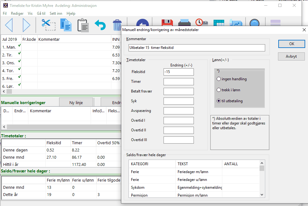 Fordelen med å bruke varianten i timelisten er at du får et tekstfelt til å forklare hva du gjør. I eksempelet under utbetales 15 timer fleksitid (merk at du må ha lønnsintegrasjon hvis dette skal gjøres automatisk).