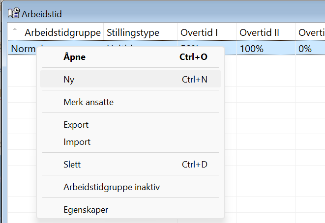 Etter at du nå har klargjort de forskjellige arbeidstidgruppene (Se Planlegge systemet) i din bedrift, kan du nå definere disse i systemet. Du må opprette hver gruppe for seg. Rekkefølgen du gjør det i, spiller ingen rolle. Stå i arbeidstidsvinduet i systemet.