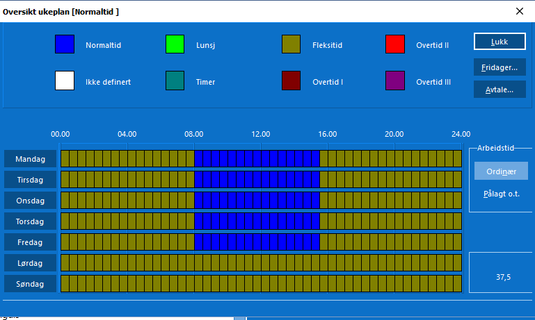 Vi leverer systemet med en vanlig "normal" arbeidstid som er basert på fleksitid. Skal du ha fleksitid kan du ta en kopi av denne og bearbeide den slik at den blir korrekt.