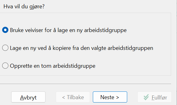 Vi anbefaler at dere oppretter en arbeidstidsmal på denne måten, hvor alle ferier f.eks. legges inn. Når man skal lage nye arbeidstidsgrupper kopierer man fra denne, og gjør endringer på arbeidsdagene etterpå (se de to neste avnsittene).