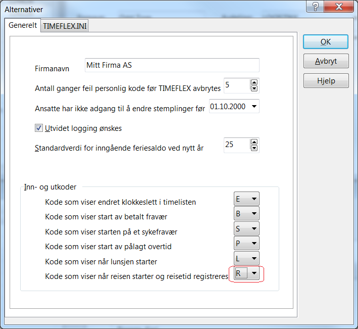 Før man benytter denne muligheten må man sjekke at en registreringskode for reisetid er satt opp. Dette foretas i Timeflex Admin under menyen Verktøy Alternativer. Velg en ønsket bokstav som du kan benytte i timelisten slik at reisetid kan bli registrert (se rød ring).