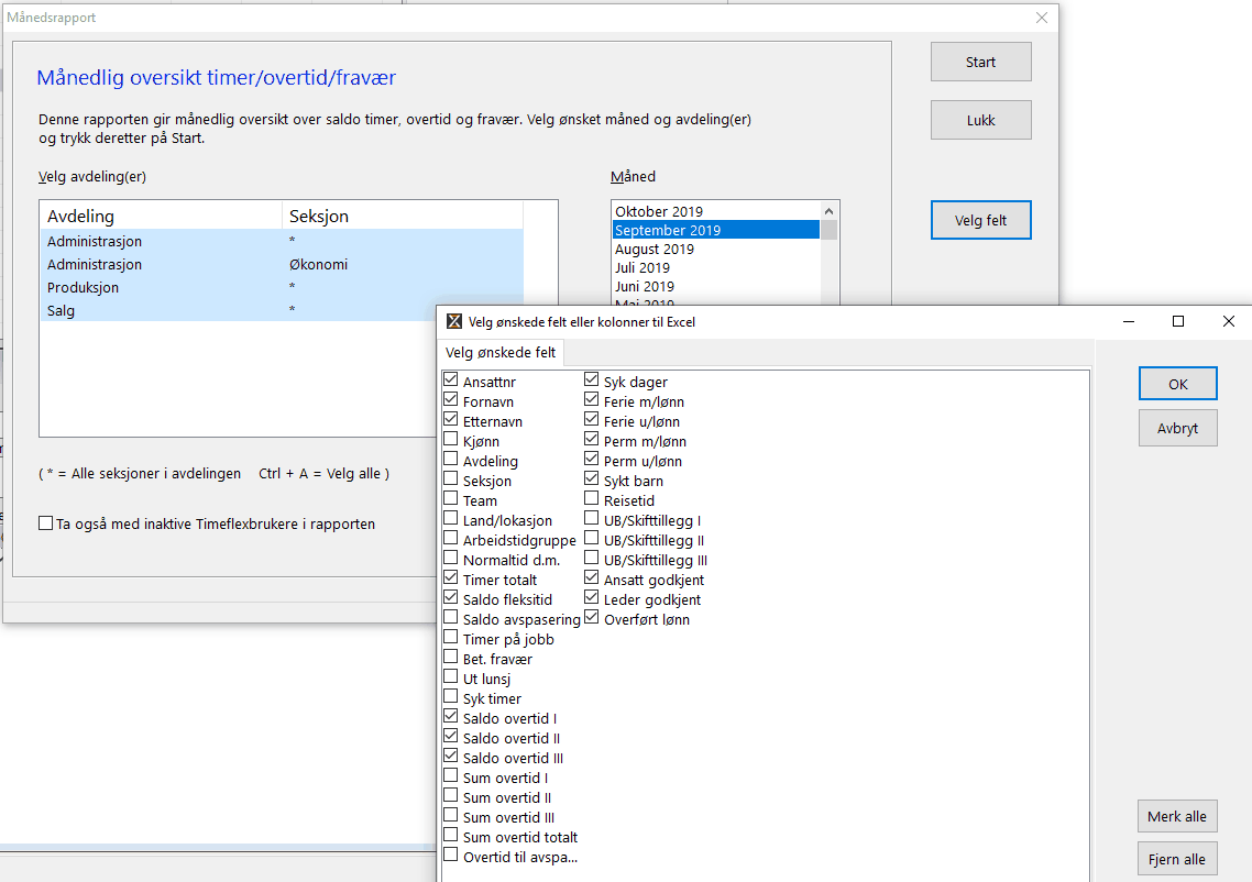 Merk de avdelingene du ønsker å kjøre rapport for (CTRL + A = alle). Velg måned. Du har en knapp som heter "Velg Felt" for å plukke ut hvilken informasjon du vil ha med i rapporten. Plukker du med alt blir det fort uoversiktilig, så plukk kun de feltene du trenger.