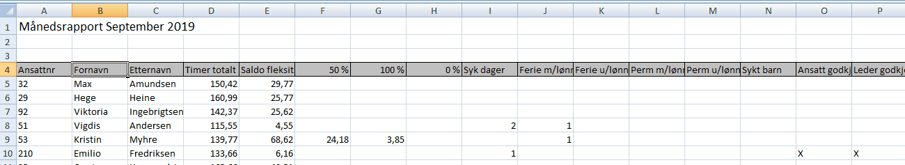 Denne brukes ofte av ledere for å få oversikt over alle ansattes totaler en måned. Ofte kjøres rapporten for godkjennig av timelisten for å få et overblikk. For de som registrerer lønn manuelt, brukes denne listen som lønngrunnlag.