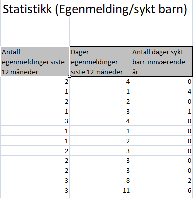 Velg rapport oppfølging sykemeldte.Velg avdeling og hak av for "ta med egenmelding /sykt barn". Da får du en oversikt over lengre sykemeldinger, egenmeldinger siste 12 måneder og dager sykt barn i år.