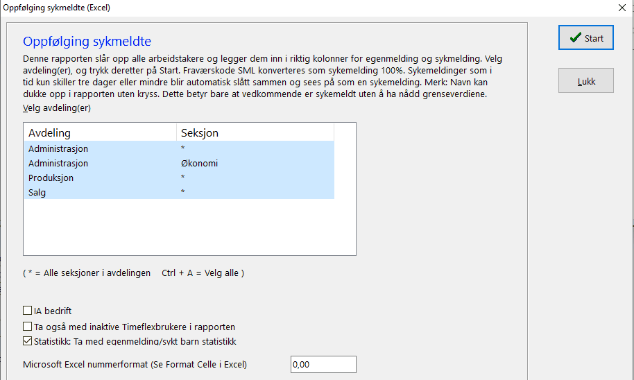<< Click to Display Table of Contents >> Navigation: Verktøy menyen > Timeflex Pluss rapporter > Oppfølging sykemeldte |