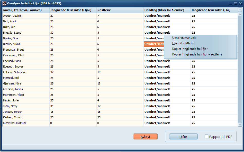 Merk at dette ikke må gjøres før det nye året er i gang. Korrigeringer gjøres ved å høyreklikke på en ansatte i ansattlisten, og velge Overfør ferie. Man kan også merke flere ansatte, høyreklikke og overføre ferie. Da vil du få flere navn i tabellen under. Tabellen viser navn, hva som var inngående ferie i fjor og hva som var restferie ved utgangen av fjoråret, samt hva som er satt som inngående feriesaldo.