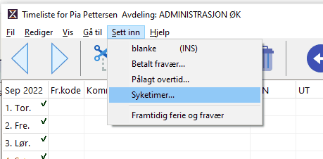 Det er nå mulig å velge "Sett inn" syketimer, og registrere syketimer frem i tid.