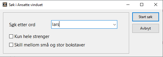 Alternativt kan man benytte funksjonen (Ctrl+F). Denne funksjonen vil søke i hele ansatt oversikten slik at for eksempel søk etter lønnsnummer eller ansattnummer også vil være mulig.