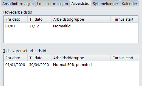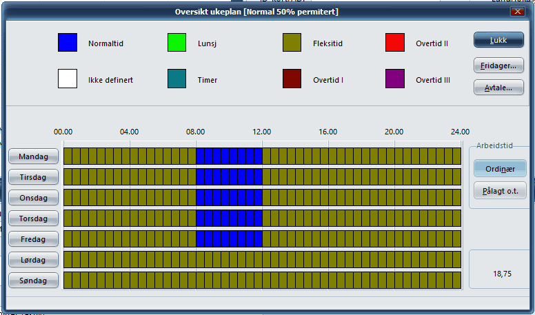 Delvis permiterte må legges inn med ny arbeidstid. Eksempelet under viser 50% permitert av en vanlig 37,5 timers uke: