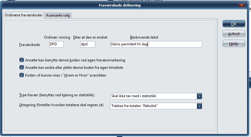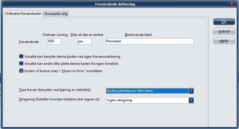 << Click to Display Table of Contents >> Navigation: Verktøy menyen > Fraværskode > Spesielt om permiteringer |