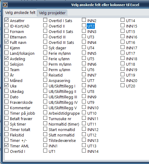 Velg den ansatte i listen. Start rapport timeliste export. Plukk ut følgende felt.
