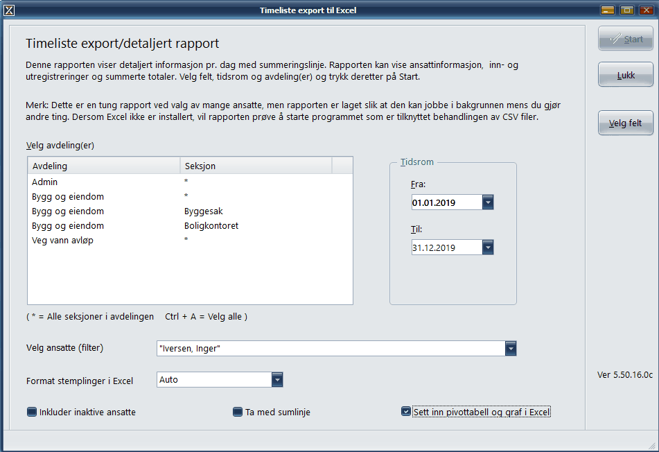 Bestill rapporten som under ved å velge avdeling, den ansatte og hake av for pivottabell.