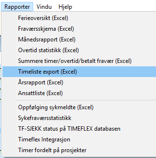 Under finner du beskrivelse på de mest brukte rapportene, og eksempel på bruk. Vi har forsøkt å sette opp rekkefølgen i brukerveieldningen etter hvilek rapporter som blir mest brukt. De fleste rapportene i Timeflex produseres til Excel, og de er laget slik at man kan bearbeide dem videre. Du kan bruke "Sortering", "Filter" og "Pivottabeller" på alle våre rapporter.